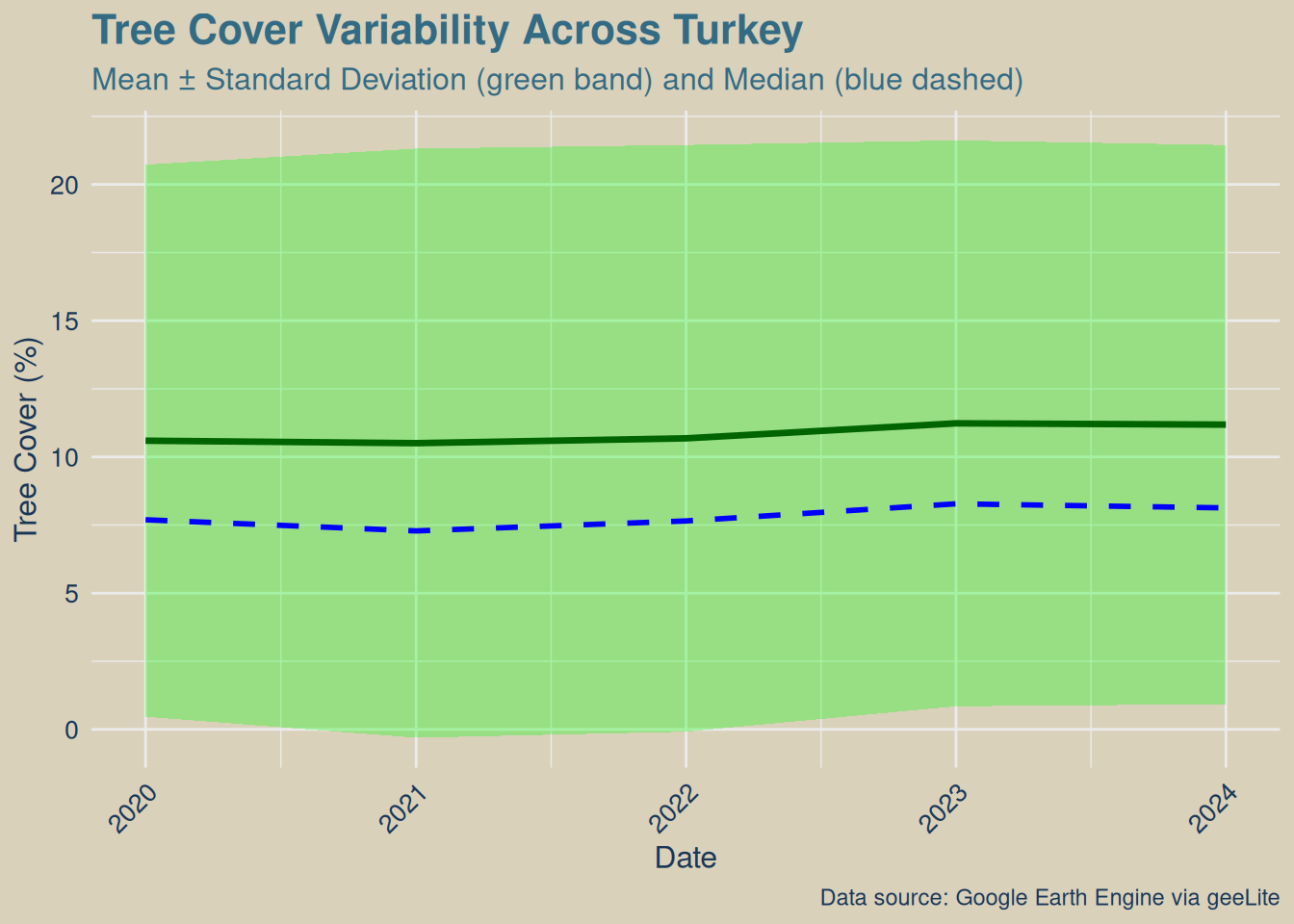 available_dates <- intersect(sample_dates, date_cols)Temporal trends in tree cover across Turkey through two complementary visualizations. The first plot shows the overall trajectory of mean tree cover values, while the second plot illustrates variability and uncertainty by displaying confidence bands around the mean trend along with median values for comparison.